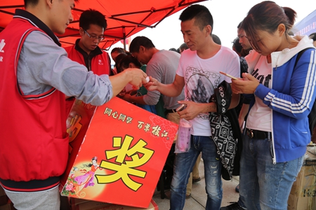 枝江酒業(yè)借用這樣的熱鬧場面,在相親活動現(xiàn)場進行微信掃碼贈酒活動,吸引了前來參加相親活動的各階層人士。在現(xiàn)場展示的產品有枝江王、百年枝江韻系列產品、情義結、謙泰吉1號、苦蕎酒等。參與者只要現(xiàn)場關注枝江酒業(yè)微信公眾號,分享到朋友圈,即可獲得一次抽獎的機會,分別會抽出“十五年經典”、“枝江情義結”、“小金版枝江王”、“小苦蕎酒”等不同價位的枝江酒。枝江酒業(yè)曾經在今年夏天,利用枝江市納涼晚會舉行微信掃碼贈酒活動,與枝江市民有效互動,讓枝江人“家家抱得美酒歸”成為酒城風景,而在此次相親節(jié)上,在“千年等一回”的浪漫中,“相親抱得美酒歸”又一次成為枝江這座中國白酒名城的風景。枝江市婦聯(lián)準備了豐富的文藝節(jié)目,在舞臺的大屏幕上,重復播放著枝江酒業(yè)出品的《酒城之戀》畫面,有一位現(xiàn)在枝江工作的外地小伙子說,希望能在枝江收獲一段像《酒城之戀》中的愛情故事。