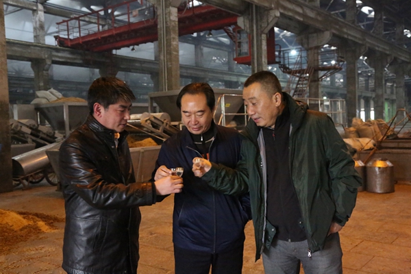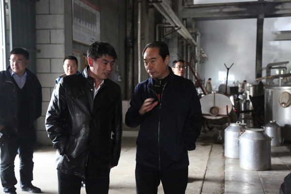 枝江酒業(yè)總裁曹榮開陪同秦書堯、朱玉祥等一行在釀造三車間參觀