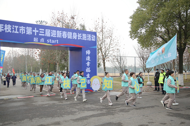 普及全民健身,締造幸福生活。12月28日上午8:30分,枝江市第十三屆迎新春健身長(zhǎng)跑活動(dòng)在枝江市文體中心鳴槍開跑。枝江酒業(yè)組織100名干部職工高擎真年份大旗,統(tǒng)一著裝,邁著矯健的步伐,以飽滿的熱情,奮勇爭(zhēng)先,在暢快淋漓的奔跑中喜迎充滿無限希望的2024新年到來。